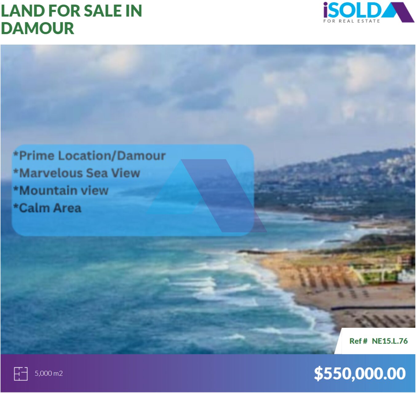أرض بمساحة ٥٠٠٠ متر مربع، بإطلالة بحرية وجبلية خلابة، للبيع في الدامور
